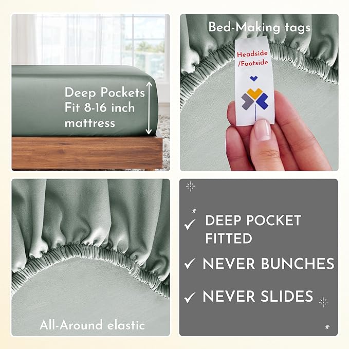 California Design Den 100% Cotton Sheets - Softest 4-Pc Set, Cooling Sheets for Bed, Deep Pockets, 400 Thread Count Sateen,Bedding Sheets & Pillowcases,Queen Sheets(Sage Green)