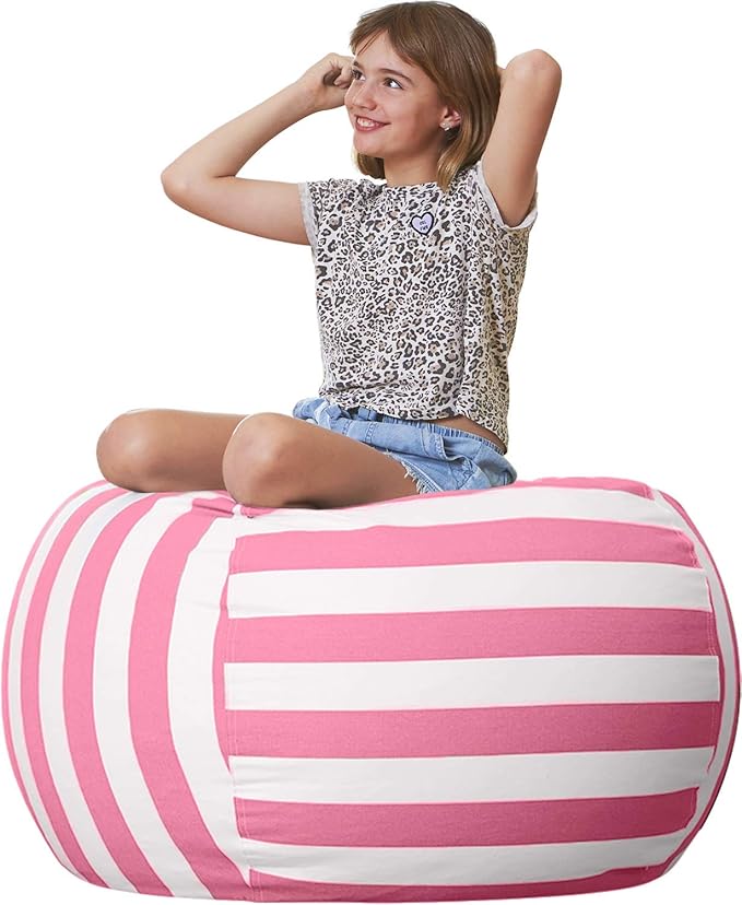 Aubliss Stuffed Animal Bean Bag Storage Chair, Beanbag Covers Only for Organizing Plush Toys, Turns into Bean Bag Seat for Kids When Filled, Large 38"-Canvas Stripes Pink/White