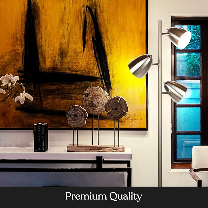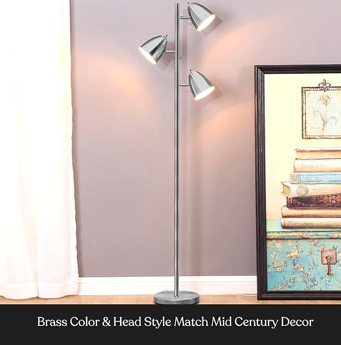 Brightech Jacob LED Standing Lamp, Modern Bright Floor Lamps for Living Rooms & Bedrooms, Tall LED Lighting Lamp with Adjustable 3 Light Tree – Satin Nickel