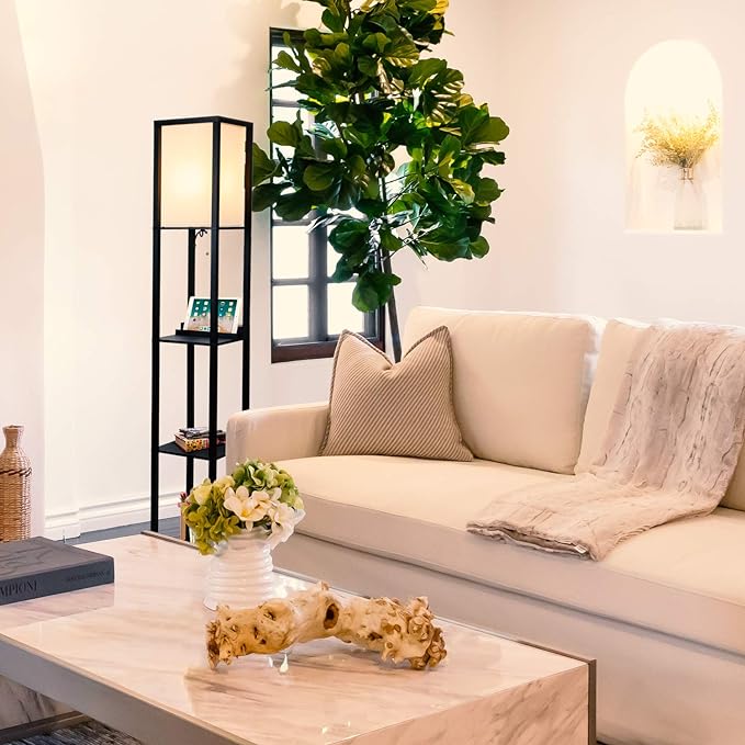Brightech Maxwell – Modern Shelf Floor Lamp with USB Ports, Wireless Charging & Outlet – Versatile Corner Display and Lamp with Shelves, Storage Solution for Living Room, Office, Bedroom – Black