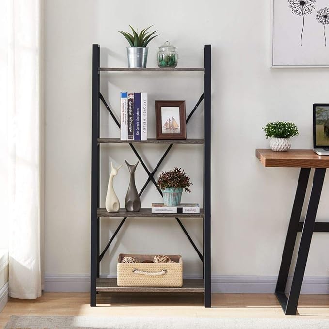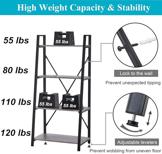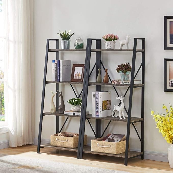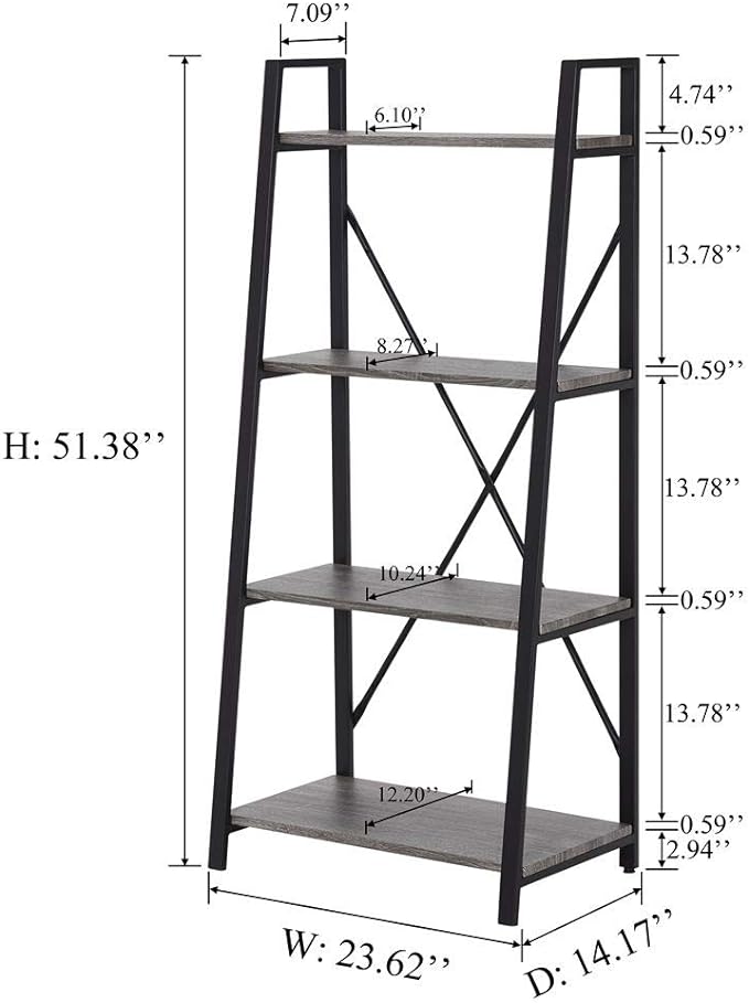 BON AUGURE Rustic Ladder Bookshelf, 4 Tier Industrial Ladder Shelf Bookcase, Standing Leaning Book Shelves for Living Room (Dark Gray Oak)