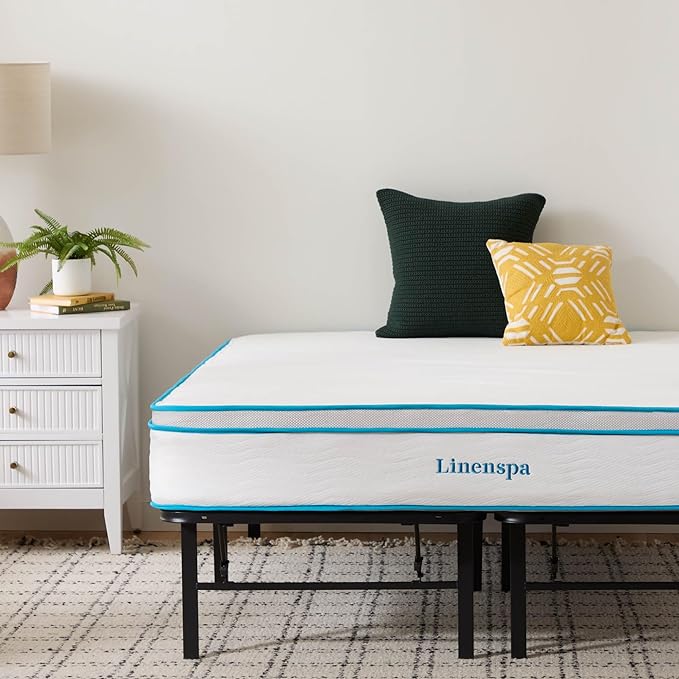 Linenspa 10” Memory Foam and Innerspring Hybrid Mattress + 14” Black Metal Platform Bedframe – Queen Mattress + Metal Folding Queen Bedframe