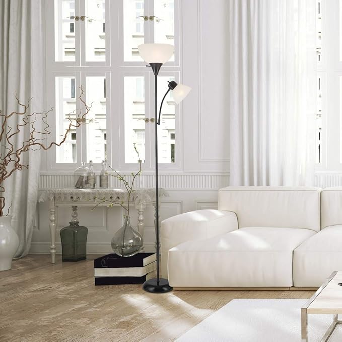 Globe Electric 67135 72" Torchiere Floor Lamp + Adjustable Reading Light, Matte Black, Frosted Plastic Shade, 3-Step Rotary Switch on Socket, Living Room Décor, Reading Light, Home Essentials