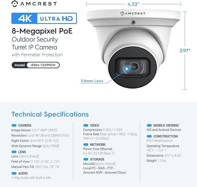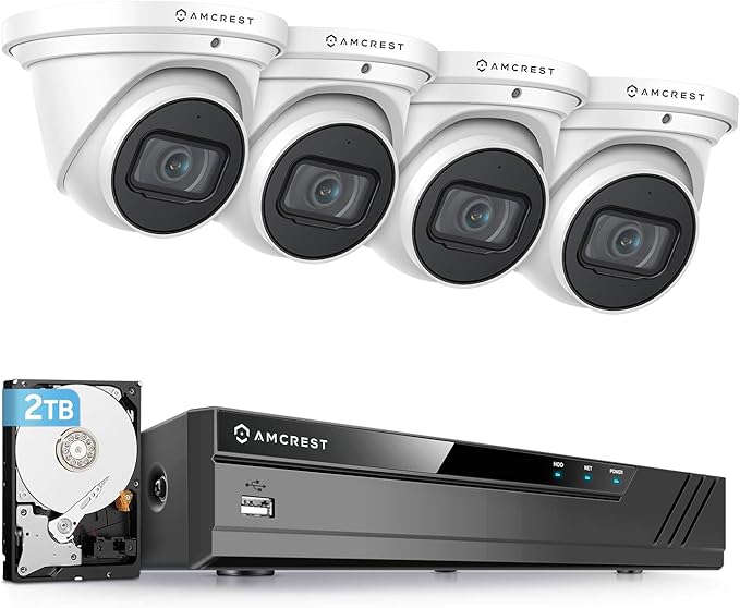 Amcrest 4K POE Security Camera System with 4K 8Ch PoE NVR (4) x 4K (8 Megapixel) Turret IP POE Cameras (3840x2160) Pre Installed 2TB Hard Drive NV4108E-IP8M-T2599EW4-2TB