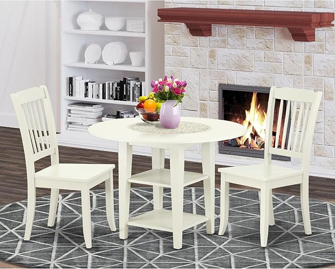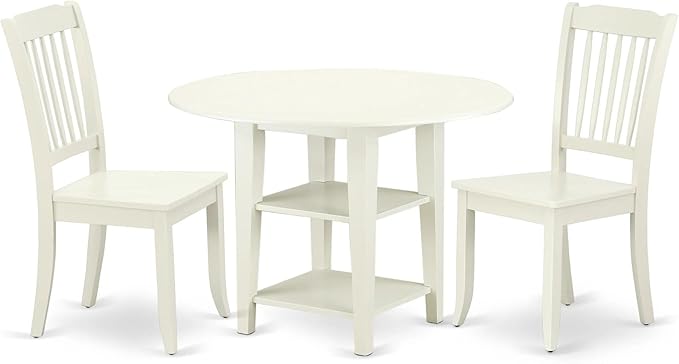 East West Furniture SUDA3-LWH-W 3 Piece Dining Room Table Set Contains a Round Dining Table with Dropleaf & Shelves and 2 Wood Seat Chairs, 42x42 Inch, Linen White