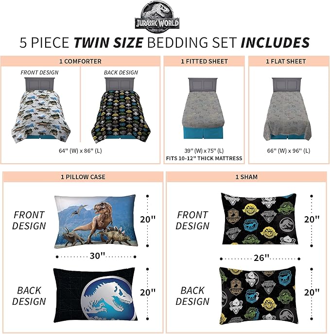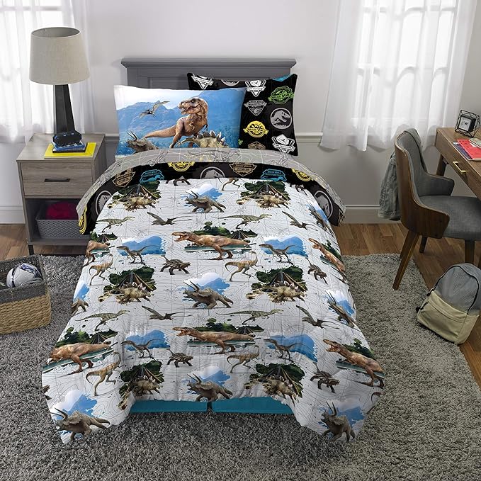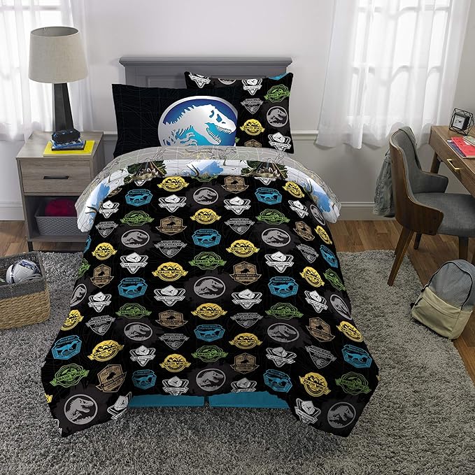Franco Kids Bedding Super Soft Comforter and Sheet Set with Sham, 5 Piece Twin Size, Jurassic World,6A1348