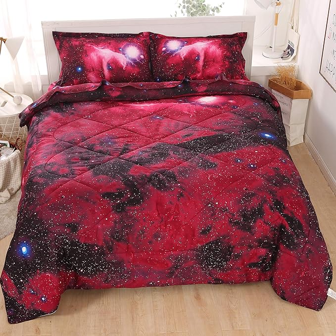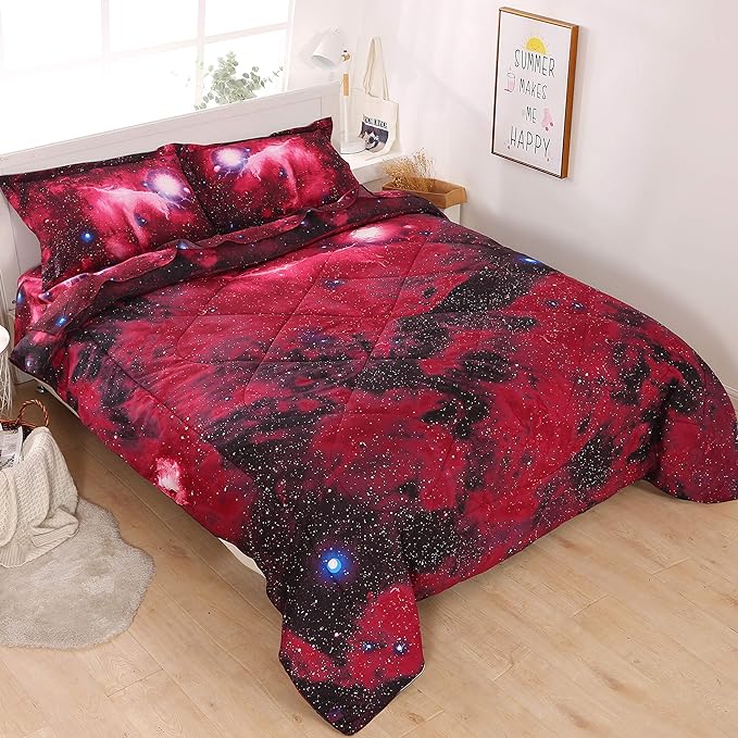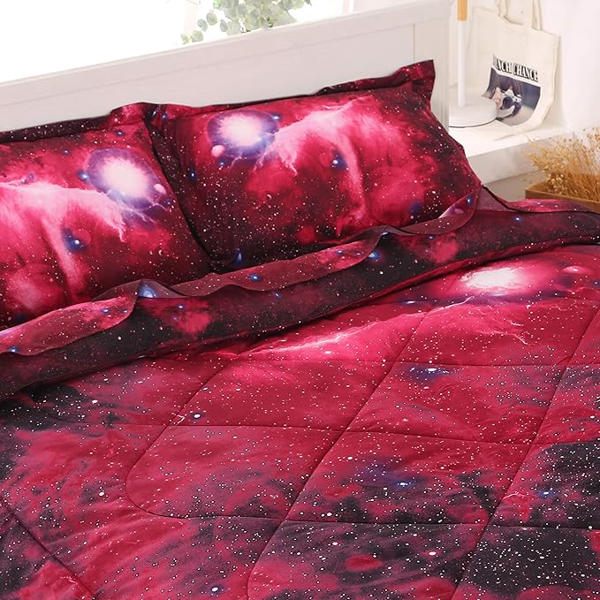 Wowelife Galaxy Bedding Sets for Boys and Girls 5-Piece Full, Premium Galaxy Bed in a Bag Red, 3D Galaxy Comforter Set, Comfortable and Soft Kids Bedding Set