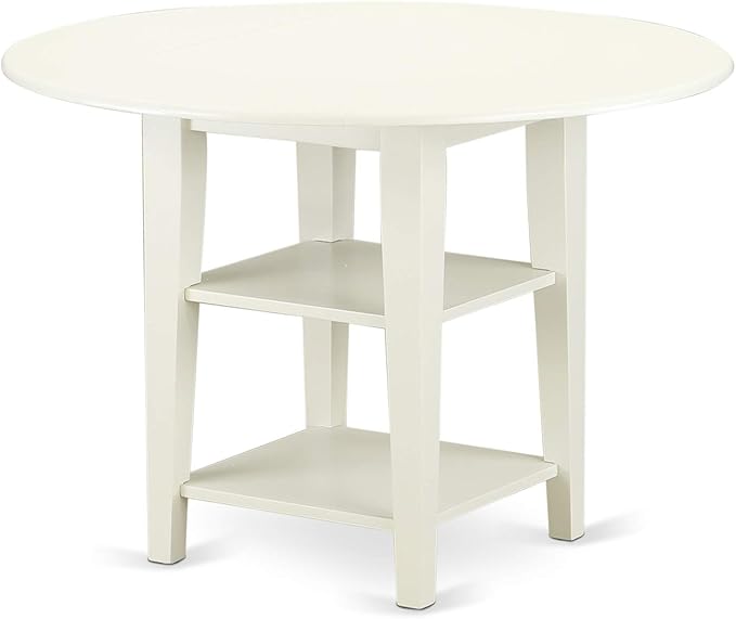 East West Furniture SUEN5-LWH-78 5 Piece Kitchen Table Set Includes a Round Dining Room Table with Dropleaf & Shelves and 4 Pink Flamingo Faux Leather Parsons Chairs, 42x42 Inch, Linen White