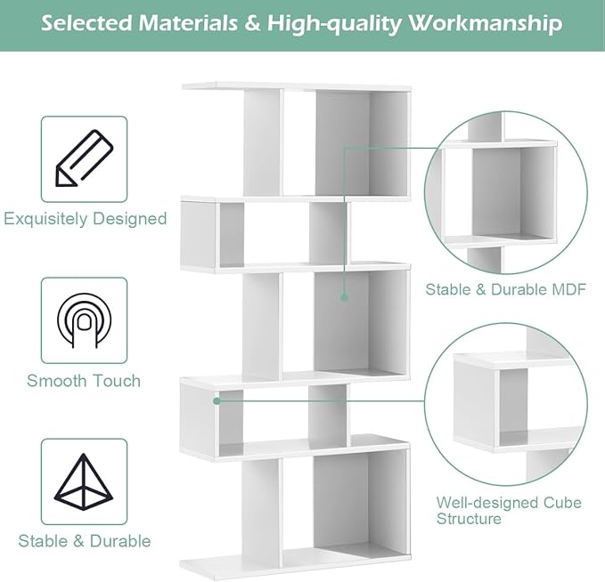 Giantex 5-Tier Geometric Bookshelf White, 70'' Tall Wood Freestanding Decorative Display Open Shelves with Anti-Tipping Device, Each Shelf Holds up to 44 lbs, Wooden S Shaped Bookcase