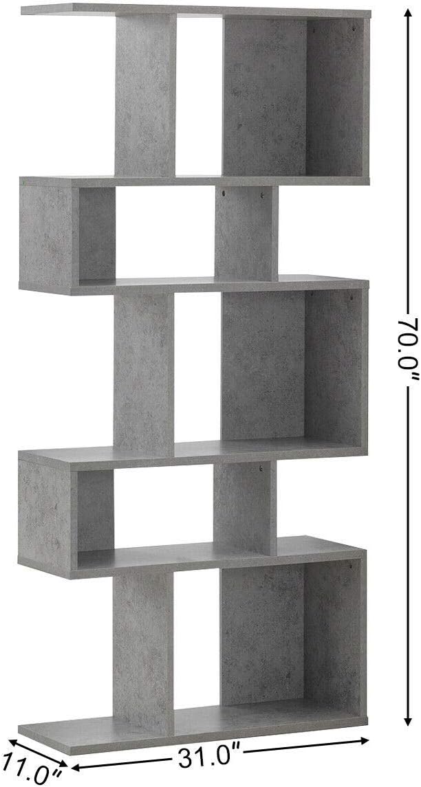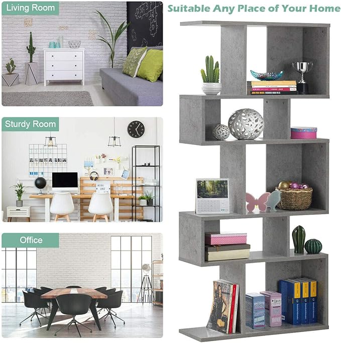 Giantex 5-Tier Geometric Bookshelf, 70" Tall Wood Freestanding Decorative Display Open Shelves with Anti-Tipping Device, Each Shelf Holds up to 44 lbs, Wooden S Shaped Bookcase, Gray