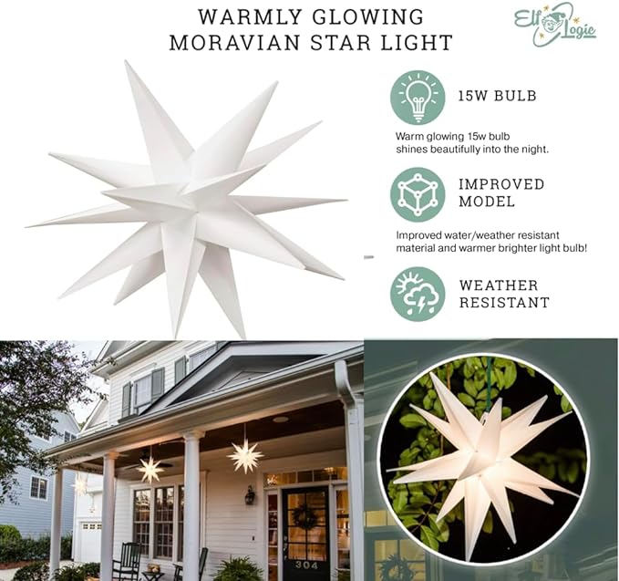 Elf Logic 18" Easy Assembly, Battery Timer White LED Moravian Star - Hanging Outdoor Christmas Star Light - Use as Holiday Decoration, Porch Light, Advent Star, Wedding and Ballroom Venue Decor