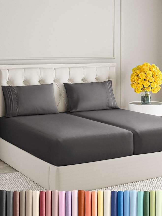 Split King Size 5 Piece Sheet Set - Comfy Breathable & Cooling Sheets - Hotel Luxury Bed Sheets for Women & Men - Deep Pockets, Easy-Fit, Soft & Wrinkle Free Sheets - Dark Grey Oeko-Tex Bed Sheet Set