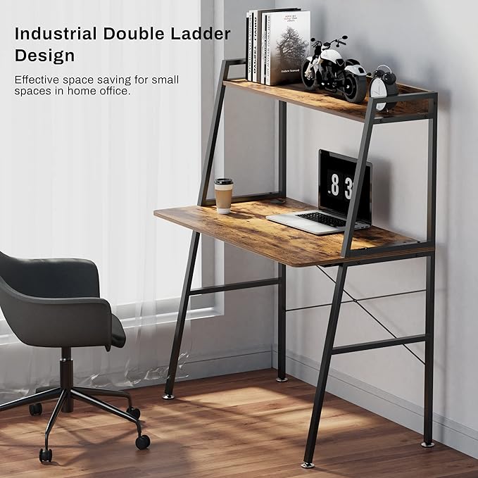 DESIGNA Small Computer Ladder Desk with Storage Shelves, 43 Inch 2-Tier Home Office Students Study Writing PC Gaming Table with Bookshelf Modern Workstation for Space Saving, Metal Frame, Rustic Brown