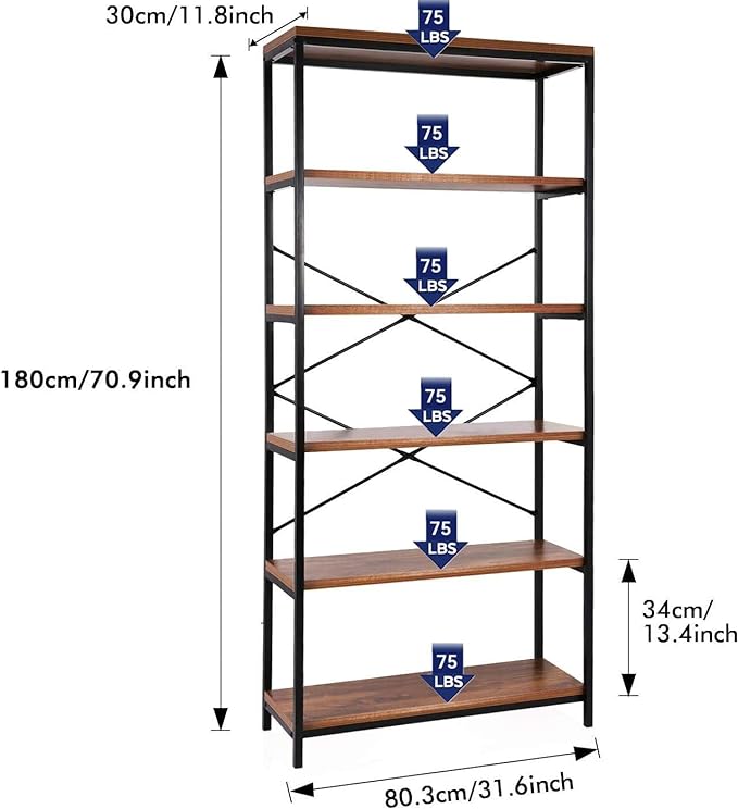 Himimi 6 Tier Industrial Bookshelf, Vintage Standing Storage Shelf, Display Shelving Units, Tall Bookcase, Industrial Metal Book Shelves for Living Room Bedroom and Home Office