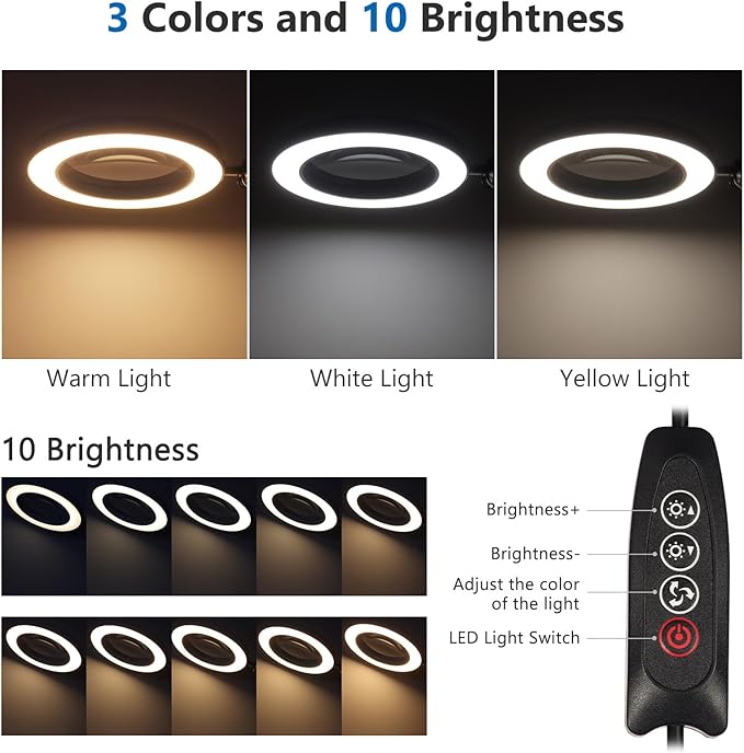 Magnifying Glass with Light and Stand, Stepless Dimming, 3 Color Modes, 10X Magnification, 4.1 Diameter Glass Lens, with Replaceable Weighted Flat Base, C-Clamp Base and Power Adapter