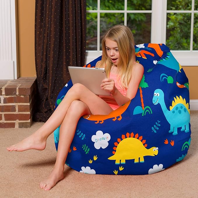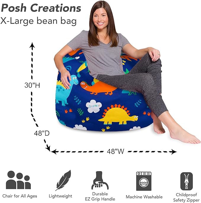Posh Creations Bean Bag Chair for Kids, Teens, and Adults Includes Removable and Machine Washable Cover, Canvas Dinos on Blue, 48in - X-Large