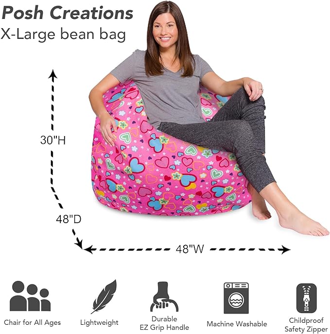 Posh Creations Bean Bag Chair for Kids, Teens, and Adults Includes Removable and Machine Washable Cover, Canvas Multi-Colored Hearts on Pink, 48in - X-Large