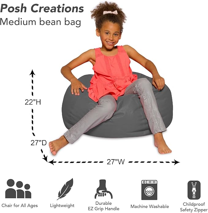 Posh Creations Bean Bag Chair for Kids, Teens, and Adults Includes Removable and Machine Washable Cover, Heather Gray, 27in - Medium