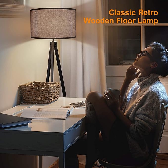 LEPOWER Wood Tripod Floor Lamp, Mid Century Standing Lamp, Modern Design Standing Lamp for Living Room, Bedroom, Study Room and Office, Flaxen Lamp Shade with E26 Lamp Base(Black)