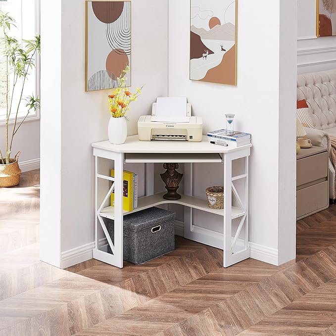VECELO Corner Computer Desk 41 x 30 inches with Smooth Keyboard & Storage Shelves for Home Office Workstation, White