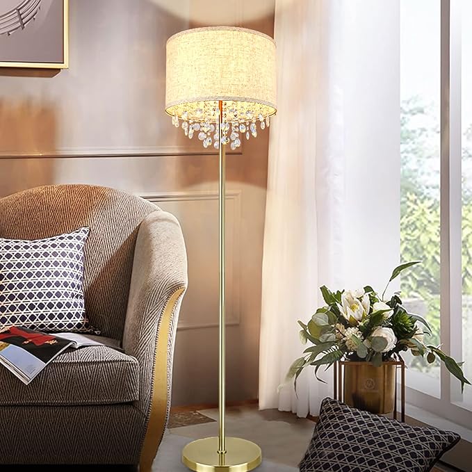 DLLT LED Floor Lamp for Living Room, Crystal Elegant Reading Standing Light for Kids Bedroom, Suit Mid Century, Modern & Farmhouse Rooms, Tall Pole with Fabric Drum Shade, Brass, E26 Warm Light