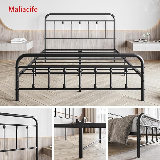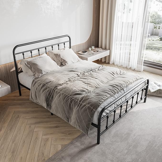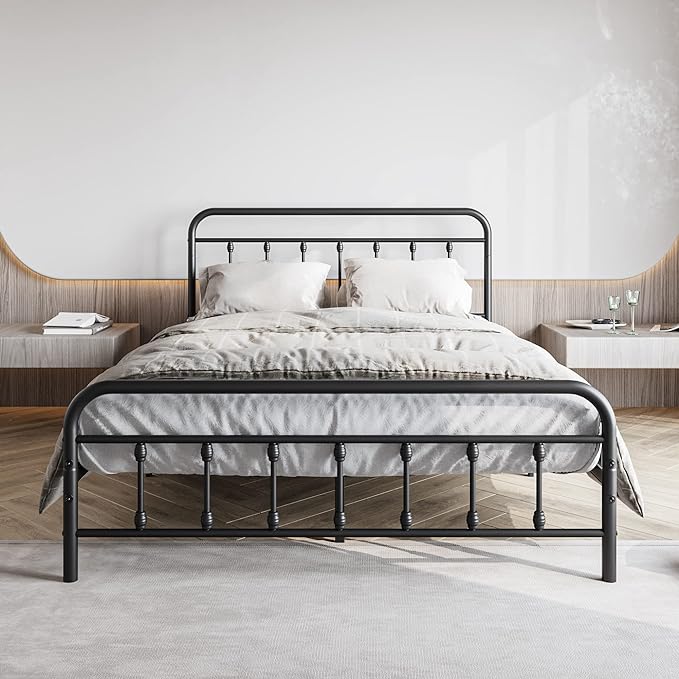 Vintage Queen Size Bed Frame with Headboard and Footboard Mattress Heavy Duty Metal Platform, Steel Slat Support (Queen, Black Sanded)