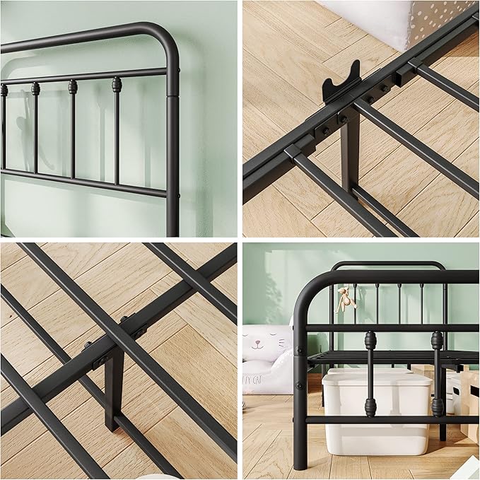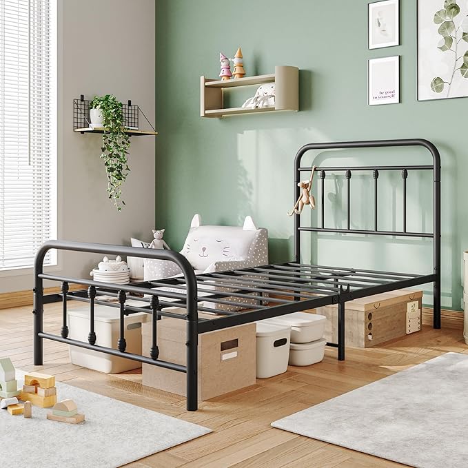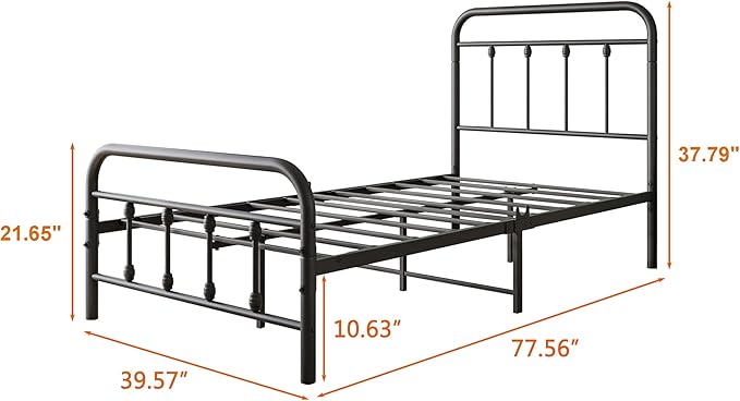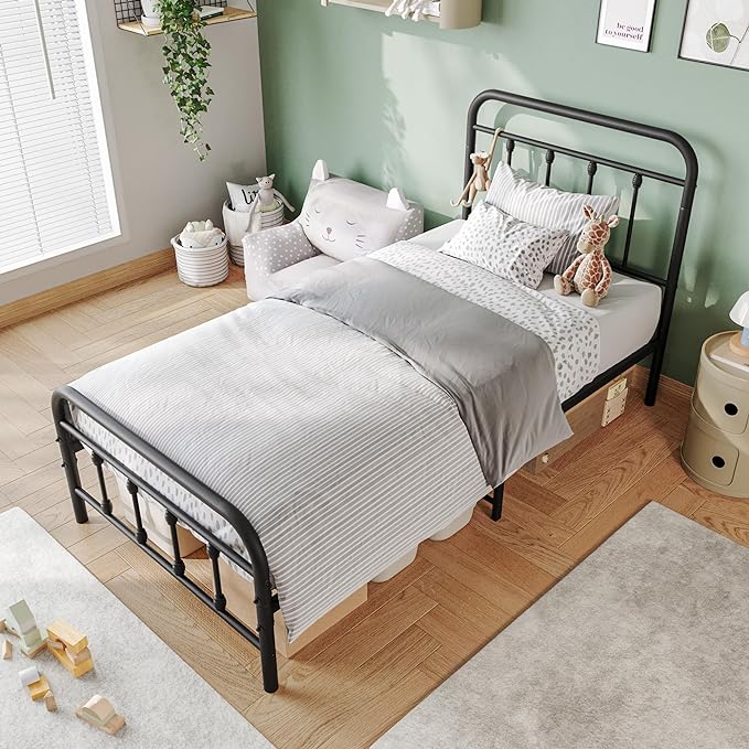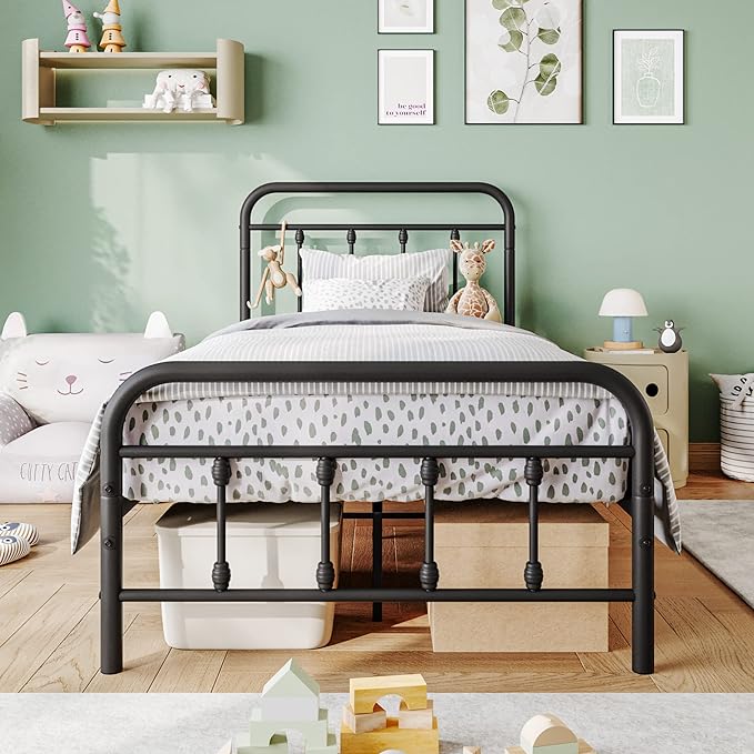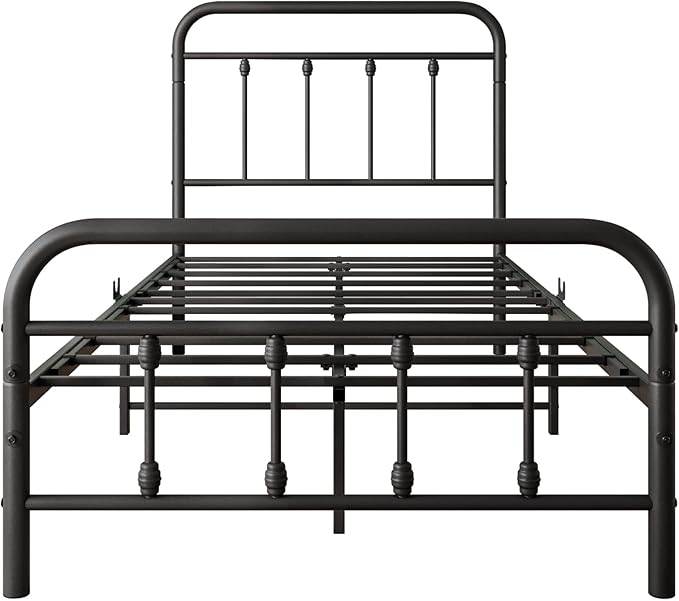 Vintage Twin Size Bed Frame with Headboard and Footboard Mattress Heavy Duty Metal Platform, Steel Slat Support (Twin, Black Sanded)