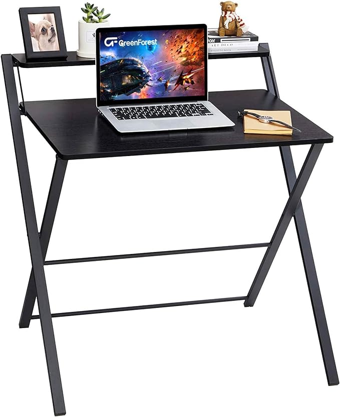 GreenForest Folding Desk No Assembly Required Large Size, 2-Tier Foldable Computer Desk with Shelf for Home Office, Space Saving Portable Laptop Study Foldable Table for Bedroom, Black
