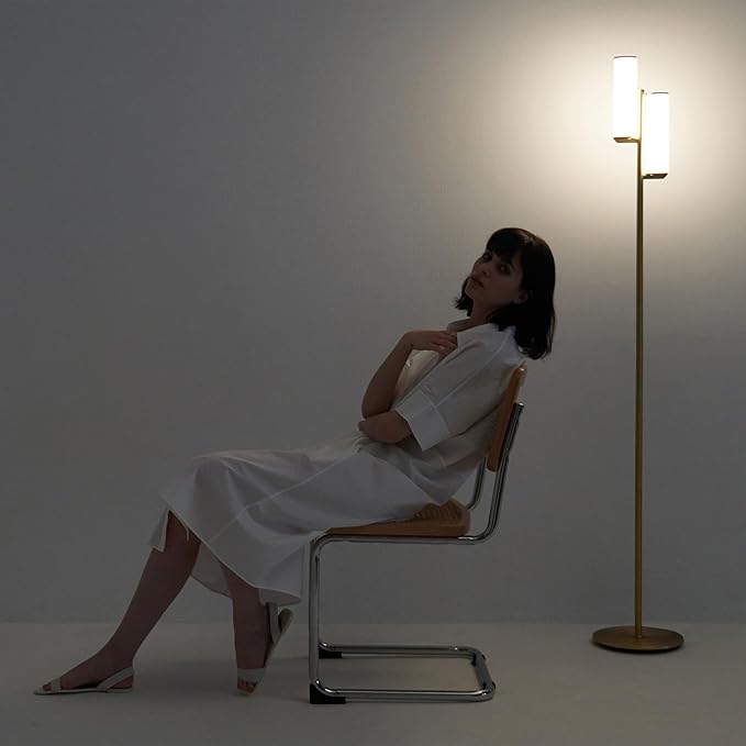 About This Stylish Mid-Century Floor Lamp: This standing lamp has a modern and simple gold stem and opaque lights will...