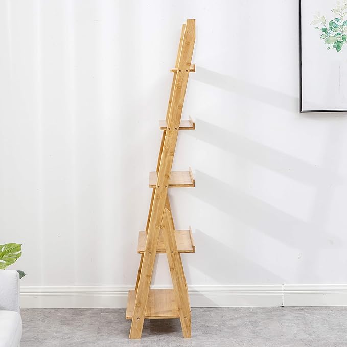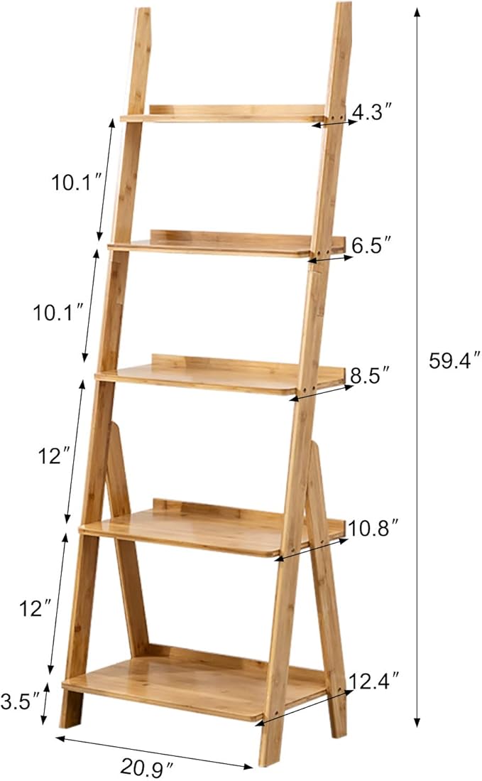 About This 【BAMBOO LEANING LADDER SHELF 】Features with 5-tier open shelves, this ladder shelf can maximize the vertical storage space...