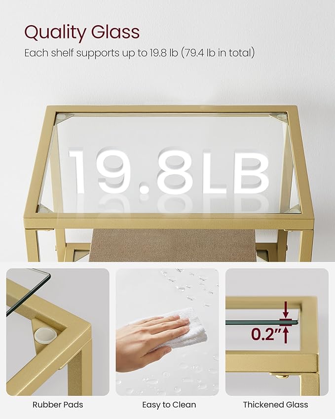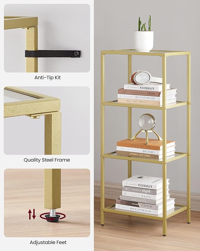 VASAGLE Bookcase, 4-Tier Bookshelf, Slim Shelving Unit for Bedroom, Bathroom, Home Office, Tempered Glass, Steel Frame, Metallic Gold ULGT28G