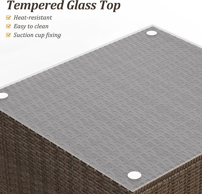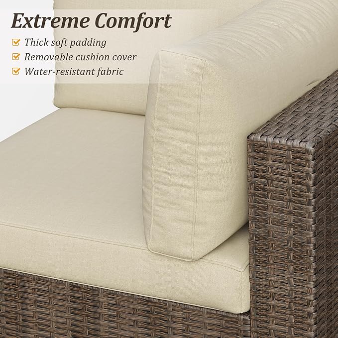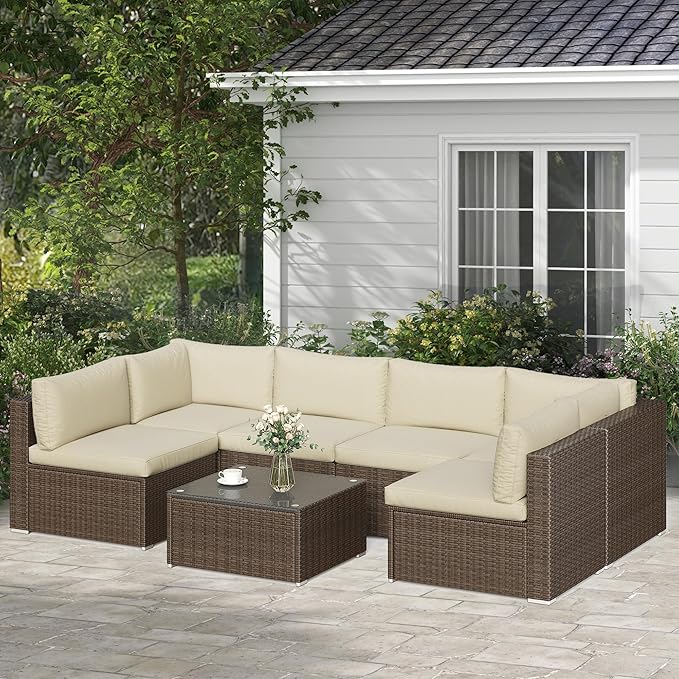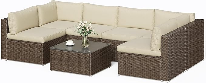 SUNVIVI OUTDOOR 7 Piece Patio Sectional Sofa Outdoor All Weather Brown PE Wicker Furniture Set, Paito Conversation Sofa Set with Glass Table, Removable Beige Cushions