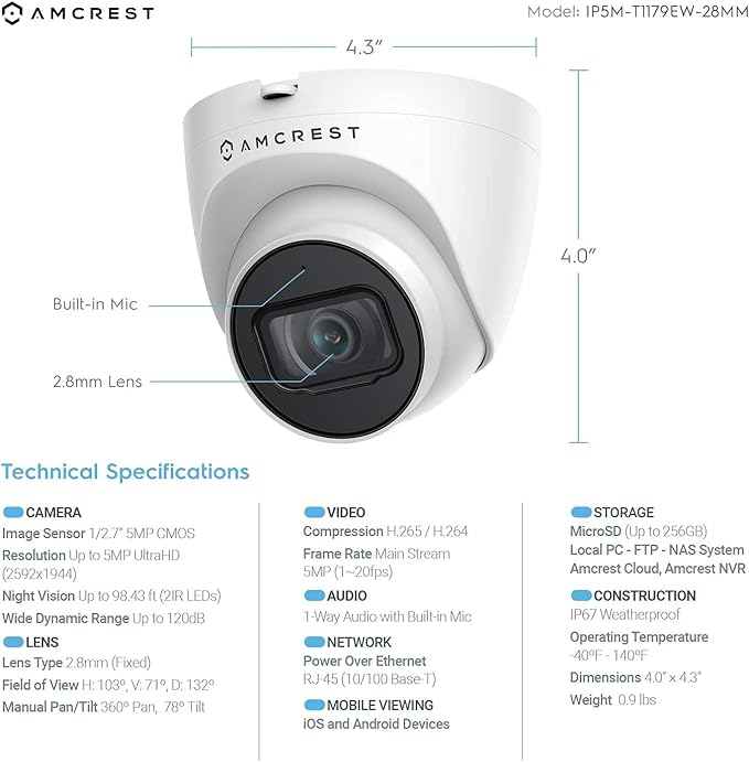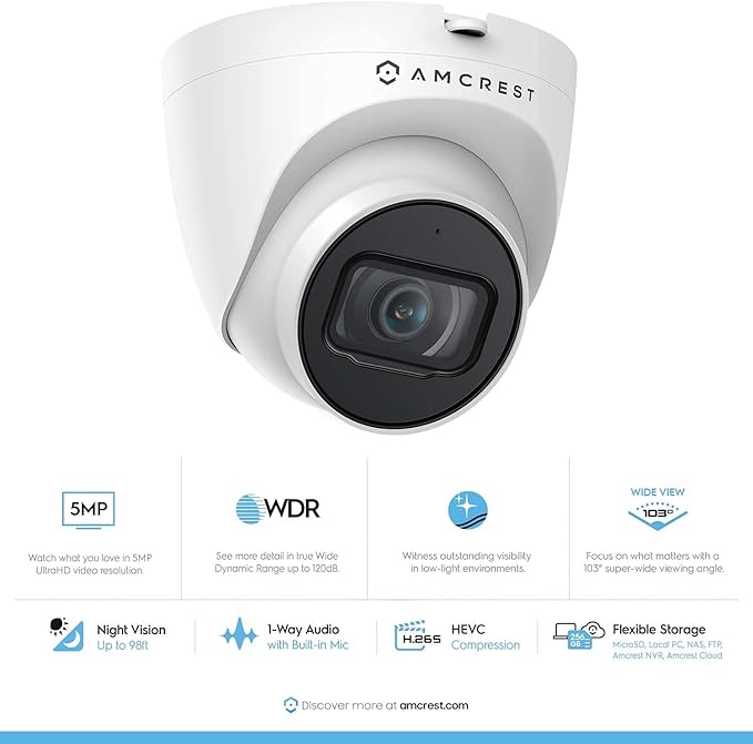Amcrest 5MP POE Security Camera System Outdoor, 8CH POE NVR, 4pcs 5MP Turret POE Cameras, IP67 Metal Turret POE IP Cameras, Built in Mic, Pre-Installed 2TB Hard Drive, NV4108E-IP5M-T1179EW4-2TB