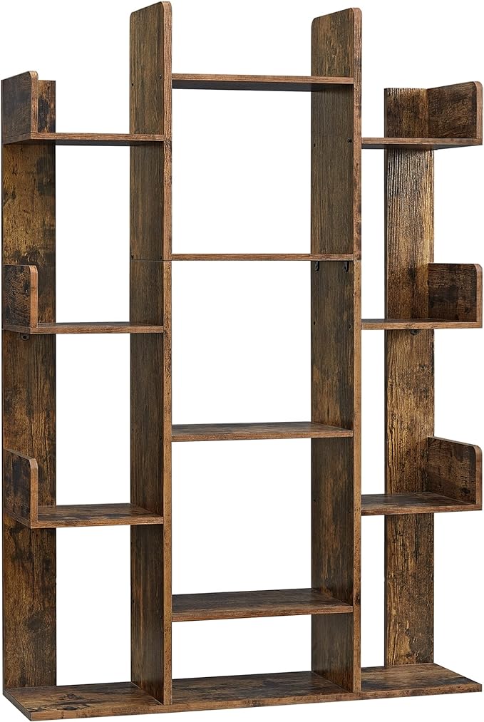 VASAGLE Bookshelf, Tree-Shaped Bookcase with 13 Storage Shelves, Rounded Corners, 9.8”D x 33.9”W x 55.1”H, Rustic Brown ULBC67BXV1