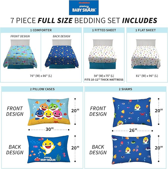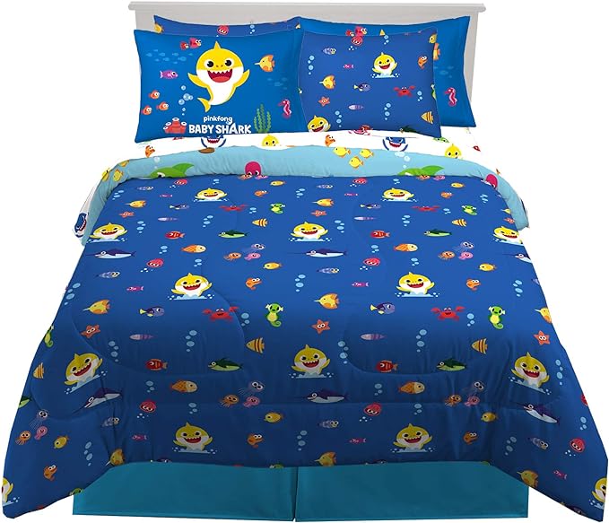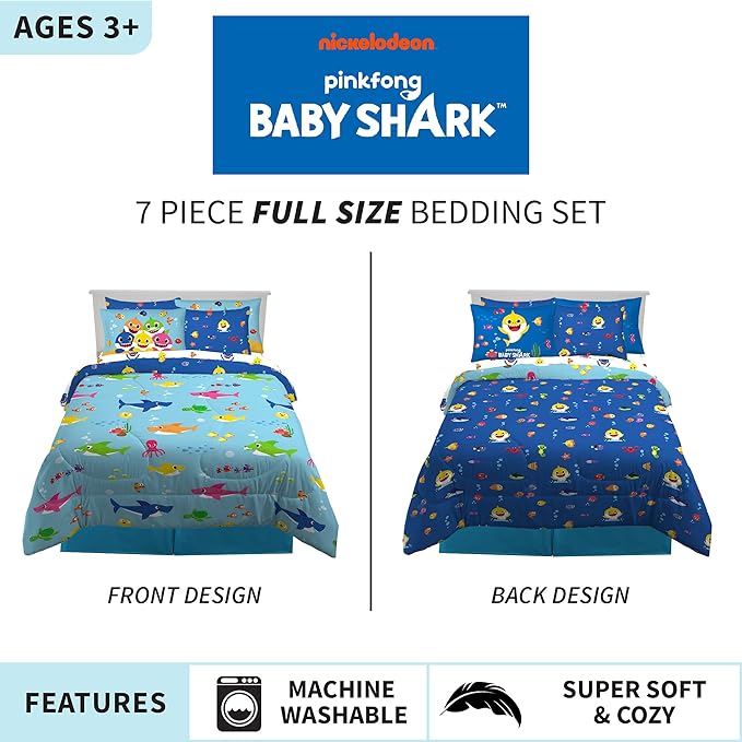 Franco Kids Bedding Super Soft Comforter and Sheet Set with Sham, 7 Piece Full Size, Baby Shark