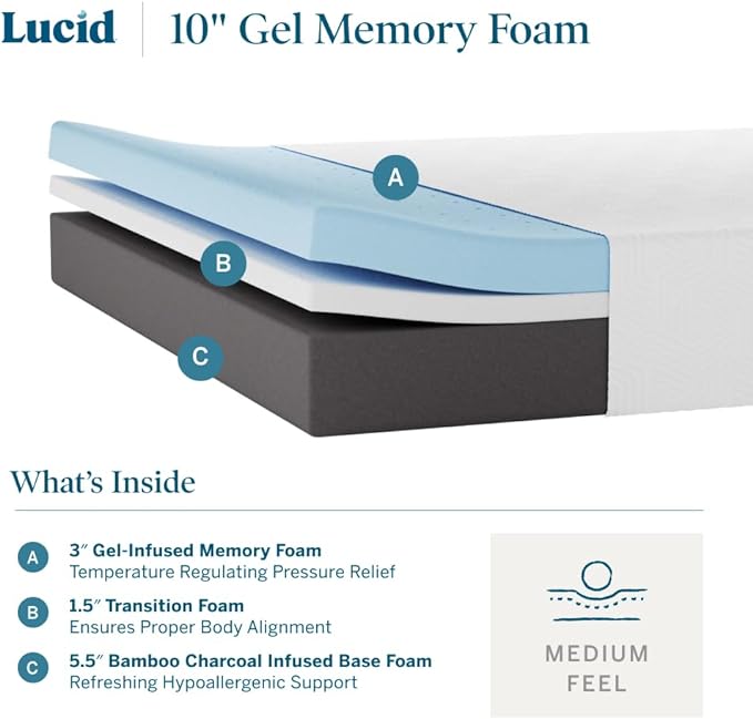 LUCID 10 Inch Memory Foam Mattress - Medium Feel - Infused with Bamboo Charcoal and Gel - Bed in a Box - Temperature Regulating - Pressure Relief - Breathable - Queen Size