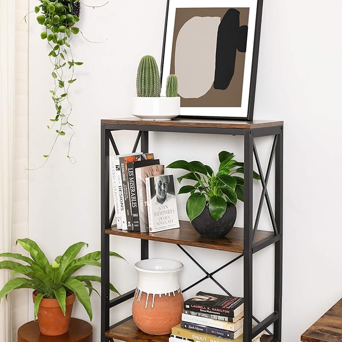 About This Particleboard, Steel [Add Visual Charisma] Matte black frame, rustic brown shelves, and X-bars—all these elements come together on...
