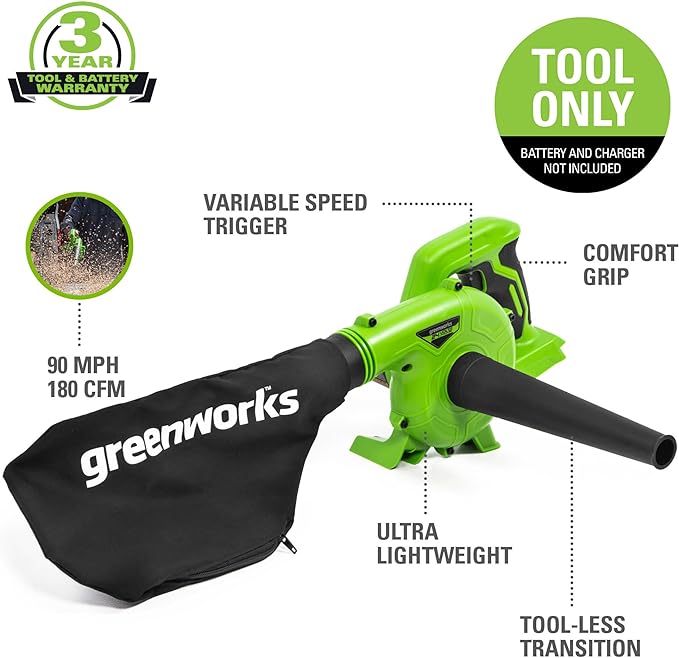 Greenworks 24V (90 MPH / 180 CFM / 125+ Compatible Tools) Cordless Shop Blower, Tool Only