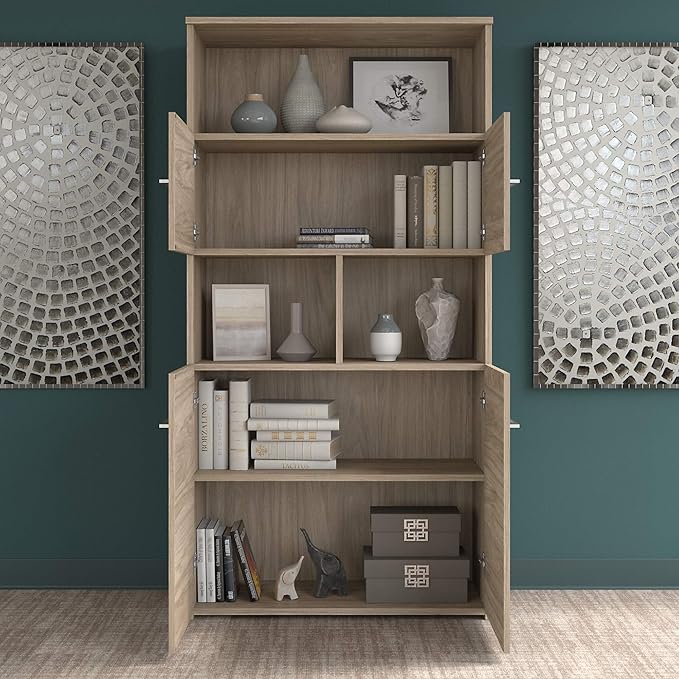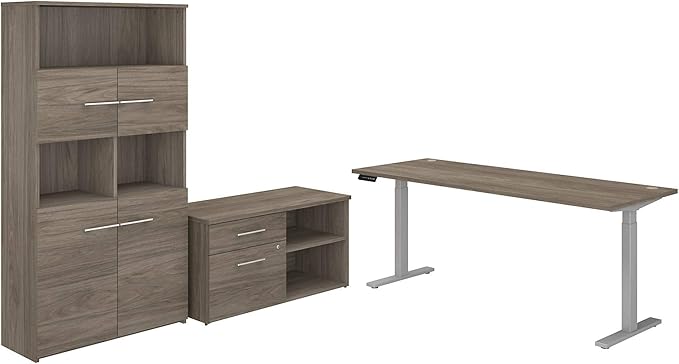 Bush Business Furniture Office 500 72W Height Adjustable Standing Desk with Storage and Bookcase in Modern Hickory