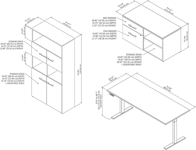 About This Bundle includes: 72W x 30D Height Adjustable Standing Desk, 45W Low Storage Cabinet with Drawers and Shelves, 36W...