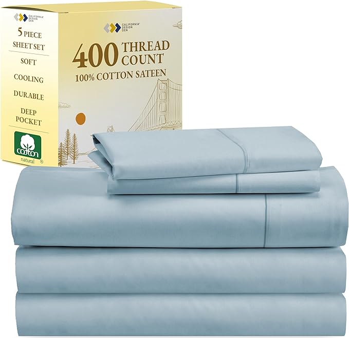 Split King Sheets for Adjustable Bed, Soft 100% Cotton Sheets, 400 Thread Count Sateen, 5 Pc Set With 2 Twin-XL Fitted Sheets, Deep Pocket Sheets,Cooling Sheets,Beats Egyptian Cotton Claims (Sky Blue)