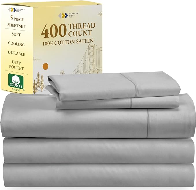Split King Sheets for Adjustable Bed, Soft 100% Cotton Sheets, 400 Thread Count Sateen, 5 Pc Set - 2 Twin-XL Fitted Sheets, Deep Pocket Sheets, Cooling Sheets, Beats Egyptian Cotton Claim (Light Grey)