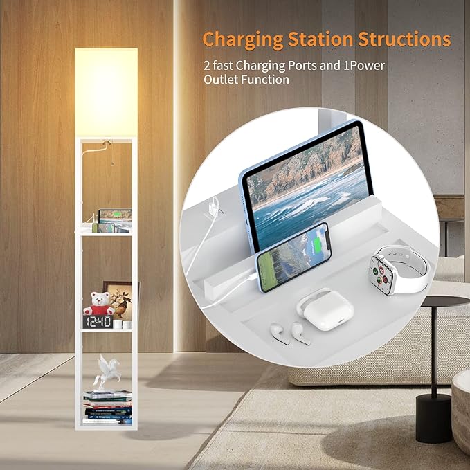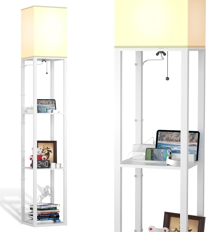 PAZZO Floor Lamp with Shelves, Shelf Floor Lamps by Real Solid Wood with 2 Charging Ports and 1 Power Outlet, Floor Lamps for Bedrooms, Lamps for Living Room,Bulb Included,White