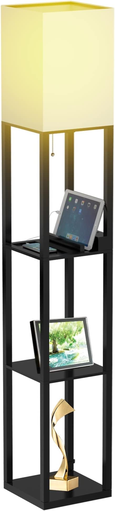 PAZZO Floor Lamp with Shelves, Shelf Lamps by Real Solid Wood with 2 Charging Ports and 1 Power Outlet, Floor Lamps for Bedrooms, Lamps for Living Room,Bulb Included,Matt Black