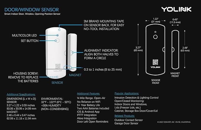 • THAT WAS EASY! Installs in moments: scan the sensor's QR code, give it a name, peel off the pre-applied 3M brand mounting tape protective plastic, press the sensor and magnet to the door and frame, and you have added security to your home or business!