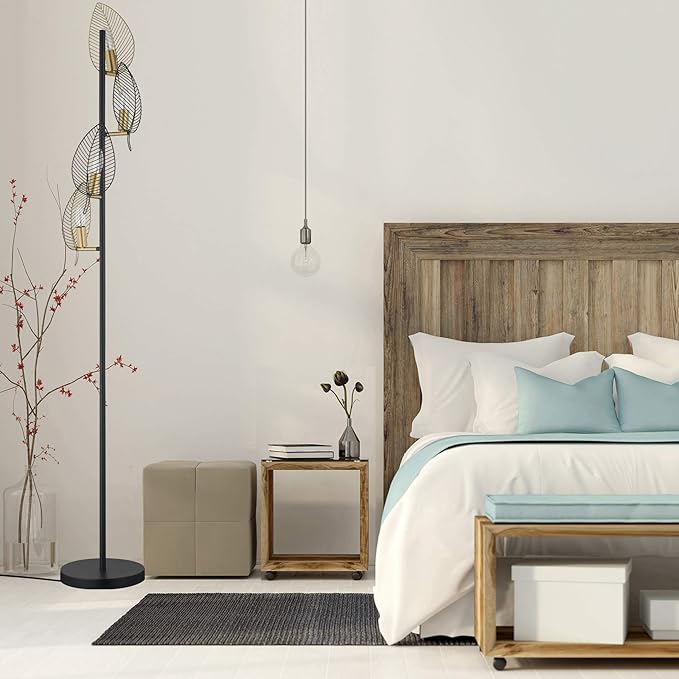 WOXXX Industrial Black Floor Lamp with 4 Brush Gold Finish Leaf Shade, Modern Tree Floor Lamps for Living Room Bedrooms Reading Standing Lamp Living Room Lamps Farmhouse Tall Lamp (4 Bulbs Included)