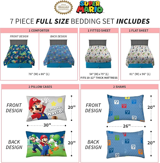 Franco Kids Bedding Super Soft Comforter and Sheet Set with Sham, 7 Piece Full Size, Mario