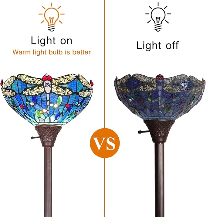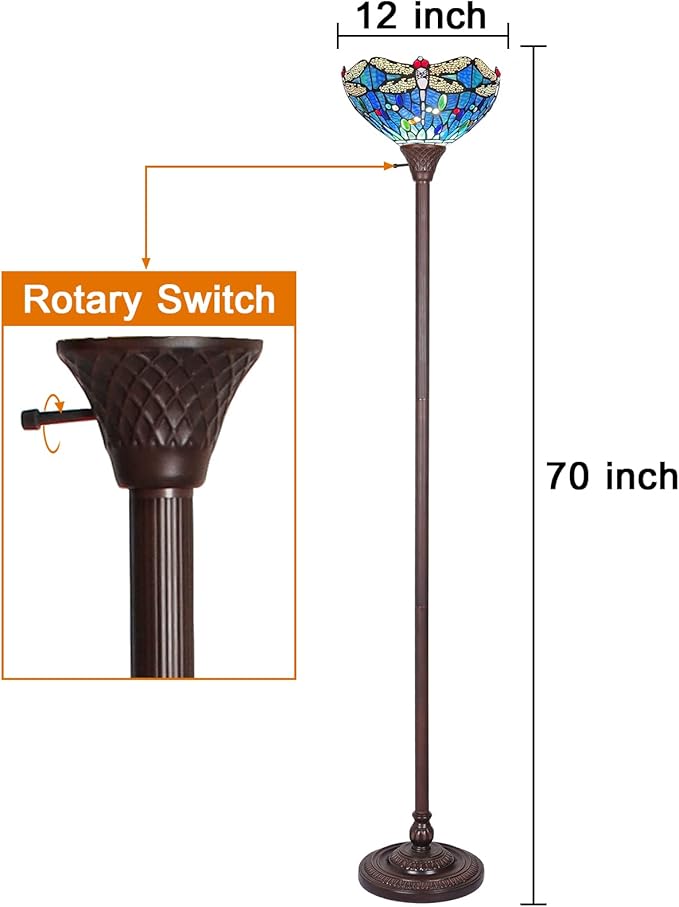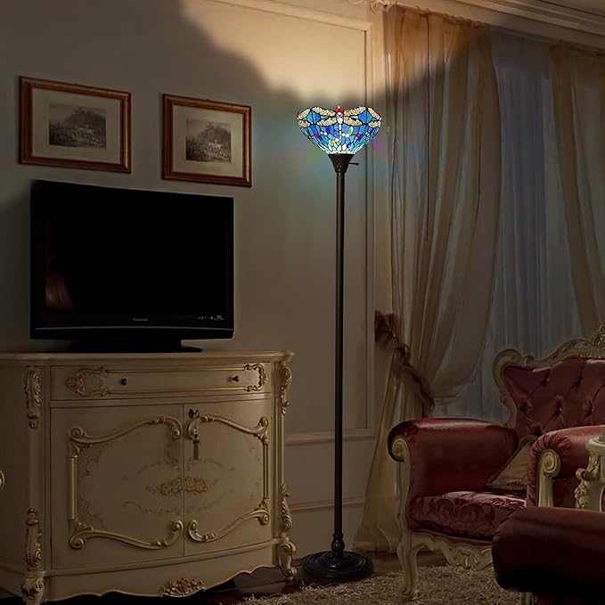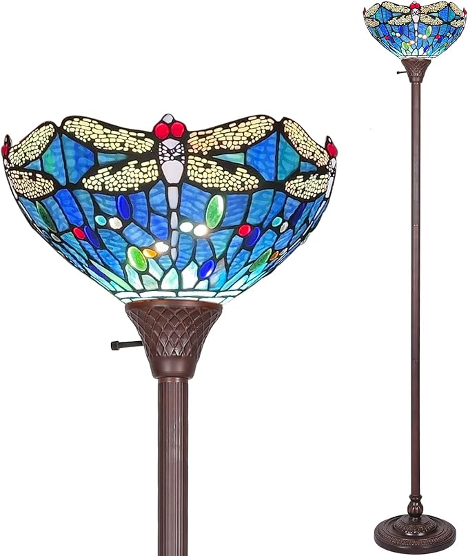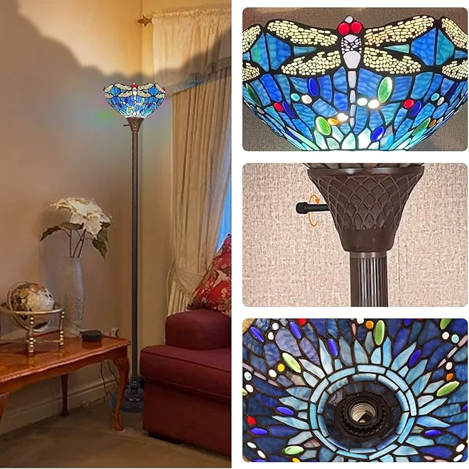 Capulina Tiffany Torchiere Floor Lamp 70 Inches Tall Industrial Pole Vintage Blue Dragonfly Style Standing Floor Light for Home Office Living Room Bedroom Farmhouse