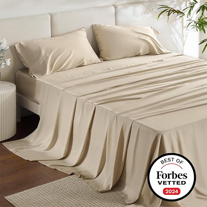 Bedsure Full Size Sheets, Cooling Sheets Full, Rayon Derived from Bamboo, Deep Pocket Up to 16", Breathable & Soft Bed Sheets, Hotel Luxury Silky Bedding Sheets & Pillowcases, Beige