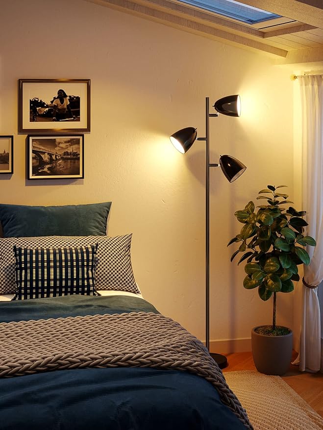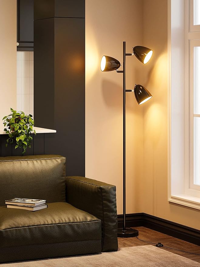 addlon Tree Floor Lamp with 3 Adjustable Rotating Lights and Matching LED Bulbs, Standing Tall Pole Lamps for Living Room, Bedroom, Home, Office - Black